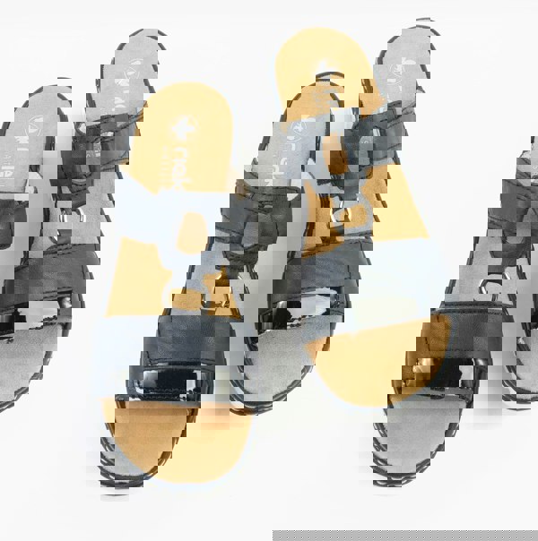 Stylish Rieker V1396-14 women's sandals in blue, designed for comfort and breathability with a slip-on style and low wedge heel.