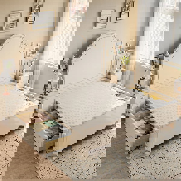 This double bed cream is made from premium oak, known for its robustness, resistance to wear, and strong load-bearing capacity, ensuring durability and minimal risk of breakage. Its rounded and substantial double oak bed frame, paired with simple, flowing lines and Roman columns, creates a romantic atmosphere. The fresh, creamy color double bed oak adds a touch of warmth to the bedroom, evoking a sense of gentleness and comfort while visually enhancing brightness and spaciousness.