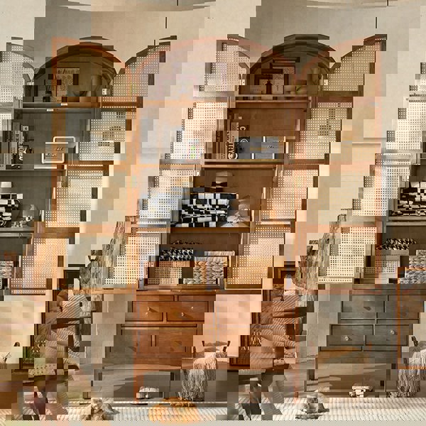 Introducing the Dylan dark wood cupboard, a vintage-inspired highboard cabinet in a rich dark wood finish. This stylish piece seamlessly blends modern utility with timeless charm. The intricate rattan detailing adds an elegant touch, creating a standout storage solution that transcends eras. Elevate your space with this vintage cupboard, where vintage aesthetics meet practical sophistication for a distinctive storage experience.