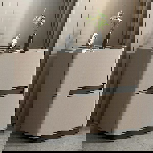 Product name: Koro Art Deco Bedside Table, Solid Wood & Leather Material Sintered Stone Table Top, Solid Wood, PU Leather Dimensions: 40/45/50/60 ( W ) x 40 ( D ) x 49 ( H ) cm Colour: Light Khaki, White, Black Assembly Needed: No Caring instructions: Wipe with a damp cloth if necessary Style: Contemporary & Modern