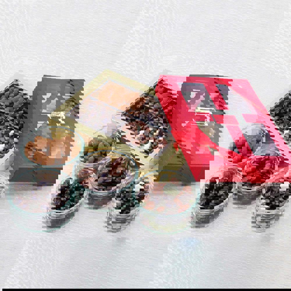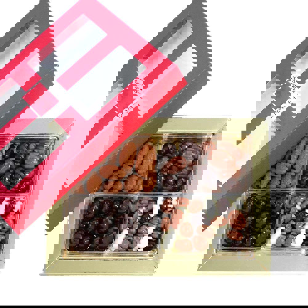 A luxury offering with four gorgeous fruits and nuts coated in chocolate. Featuring pieces of crystallised ginger encased in premium dark chocolate; plump Californian sun-ripened almonds smothered in delicious milk chocolate; delicious dark chocolate covered almonds and finally, tasty cinnamon dusted, milk chocolate coated almonds. This is a beautiful, ready to gift chocolate box, that will be enjoyed by all.
