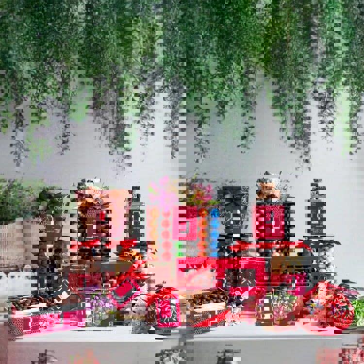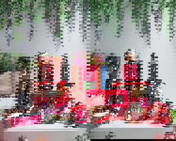 Our Rita Farhi gift hamper comes in a stylish red and white presentation box, filled to the brim with sumptuous treats of our customer favourites.