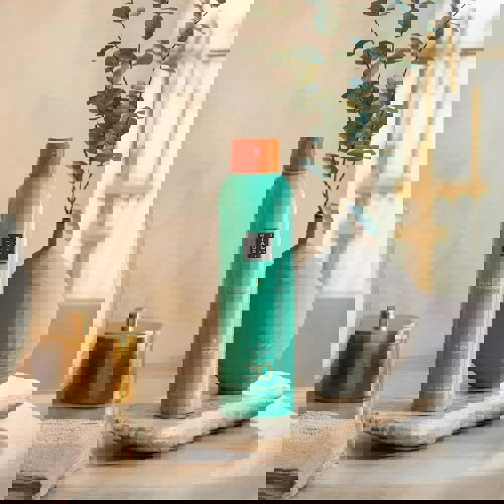 Rituals Karma Sun Protection Milky Spray, is a lightweight, hydrating body lotion spray with SPF 30 that absorbs quickly without leaving a white cast or sticky residue.