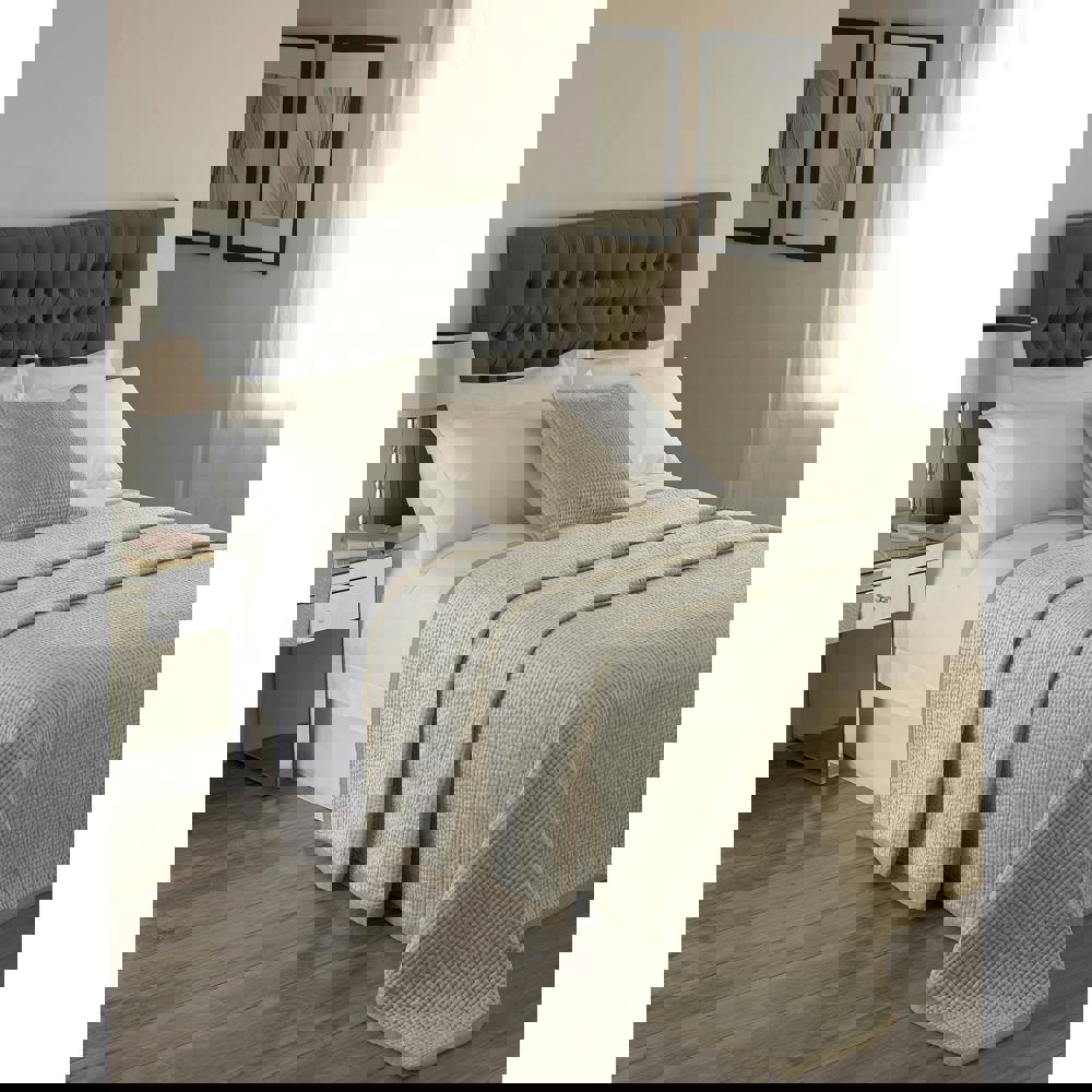 The supremely soft material is presented in a champagne cream colourway, with a delicate velvet-look quilted design. The textured finish is designed to catch the light from different angles, adding subtle depth and interest across the bed. Finished with a linen border, it creates a neat, considered edge for a more polished overall look.