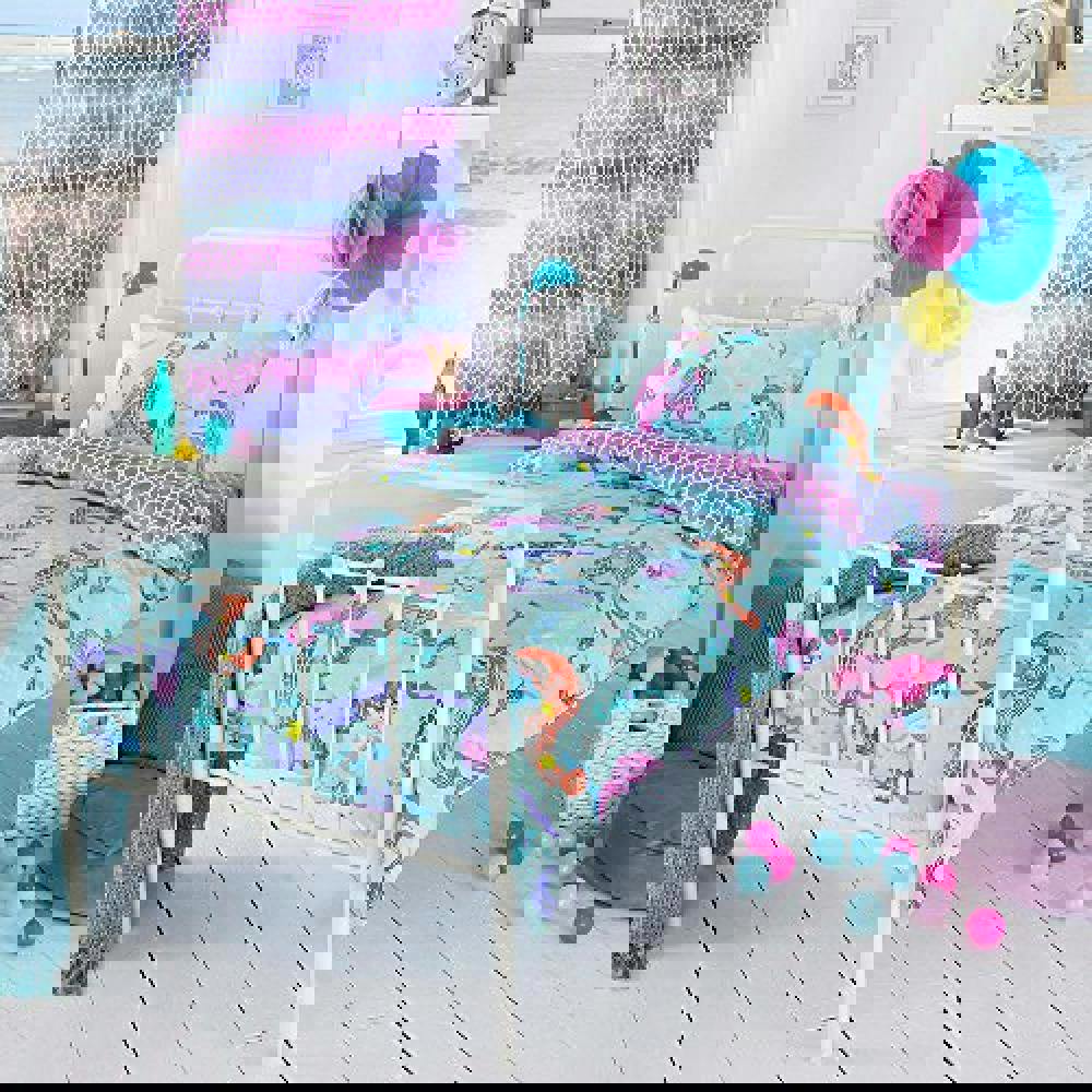 Turn it over for a pink, purple and blue mermaid scale reverse, giving you two looks in one. The duvet cover fastens with a secure button closure, while the pillowcases are finished with child-friendly envelope closures. Made from a polycotton blend, this bedding is soft to the touch and hard-wearing for everyday use.