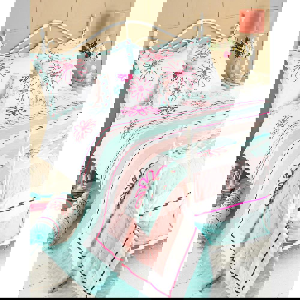 Made from a 50% cotton and 50% polyester blend, this bedspread is sized at 240 x 260cm. It is presented in duck egg and pink, bringing soft colour to the bedroom while remaining easy to style with a variety of interiors.