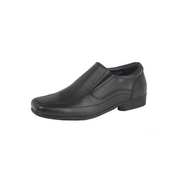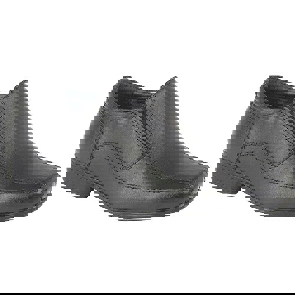 These Roamers children’s school shoes are made from leather and finished in black. A twin gusset construction and stretch elastic allow the fit to be adjusted with ease. The shape is completed with a square toe and a raised heel for a structured profile.