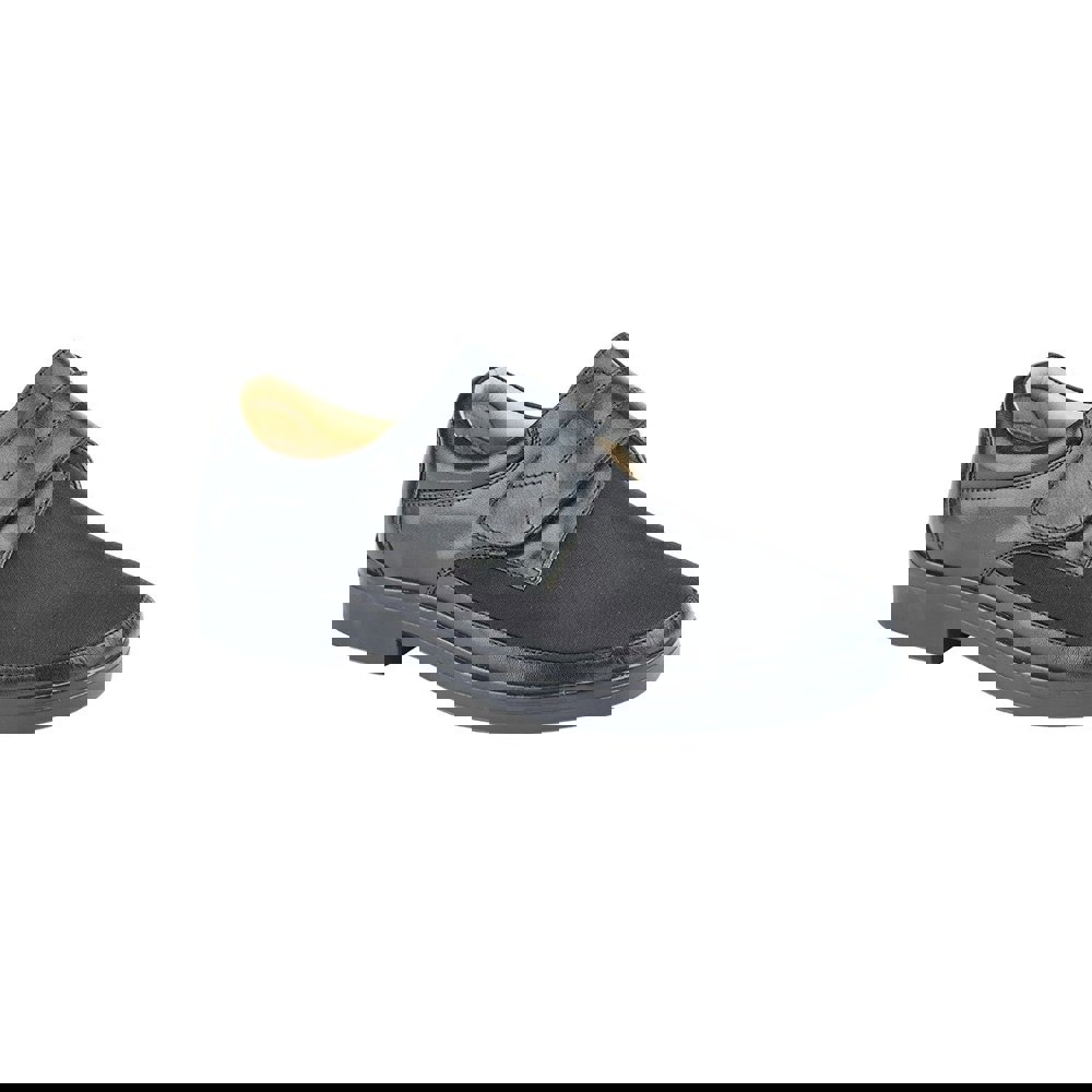 These men’s shoes from Roamers come in black with a textured finish and a low heel. The upper combines leather and textile, with an elastane and leather lining. An elastic fabric element and touch fastening complete the construction.
