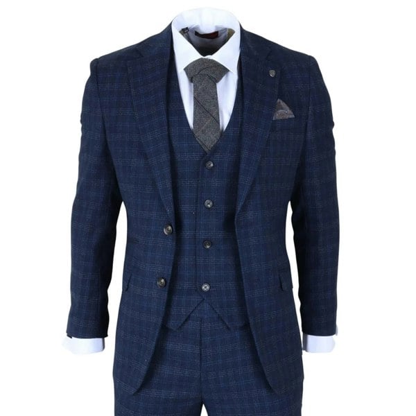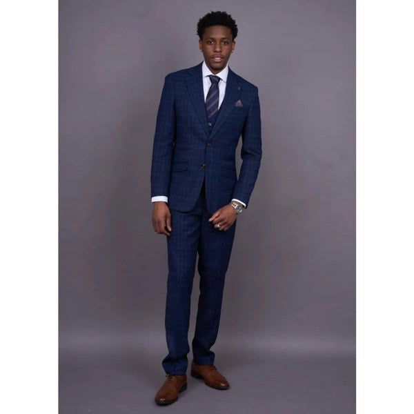 * Classic Navy Blue Plaid Pattern: Featuring a subtle plaid check in a deep navy tone, this suit brings a refined touch to formalwear, suitable for weddings, business functions, and evening events