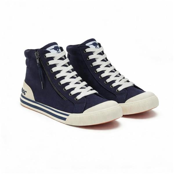In a versatile navy finish, the Rocket Dog Jazzin Hi 12A Canvas hi-top trainers keep things pared back and easy to wear. This womens style pairs a canvas upper with a jersey lining, creating a clean, casual look that works well with everyday outfits. A round toe maintains a classic profile, while the ankle-height shaft gives the silhouette its distinctive hi-top shape.