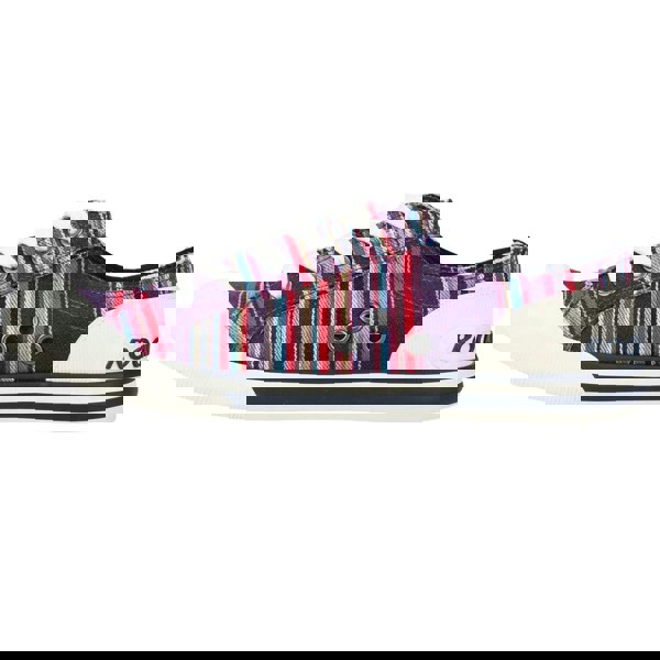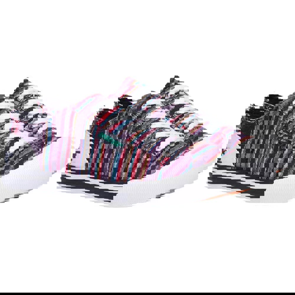 These Rocket Dog Jazzin Aloe Stripe trainers bring a low-cut profile with a multicoloured striped design. The upper is made from textile, finished with raw cut trims, frayed edges and a rubber toe cap. A round toe and flat sole keep the silhouette clean and easy to wear.