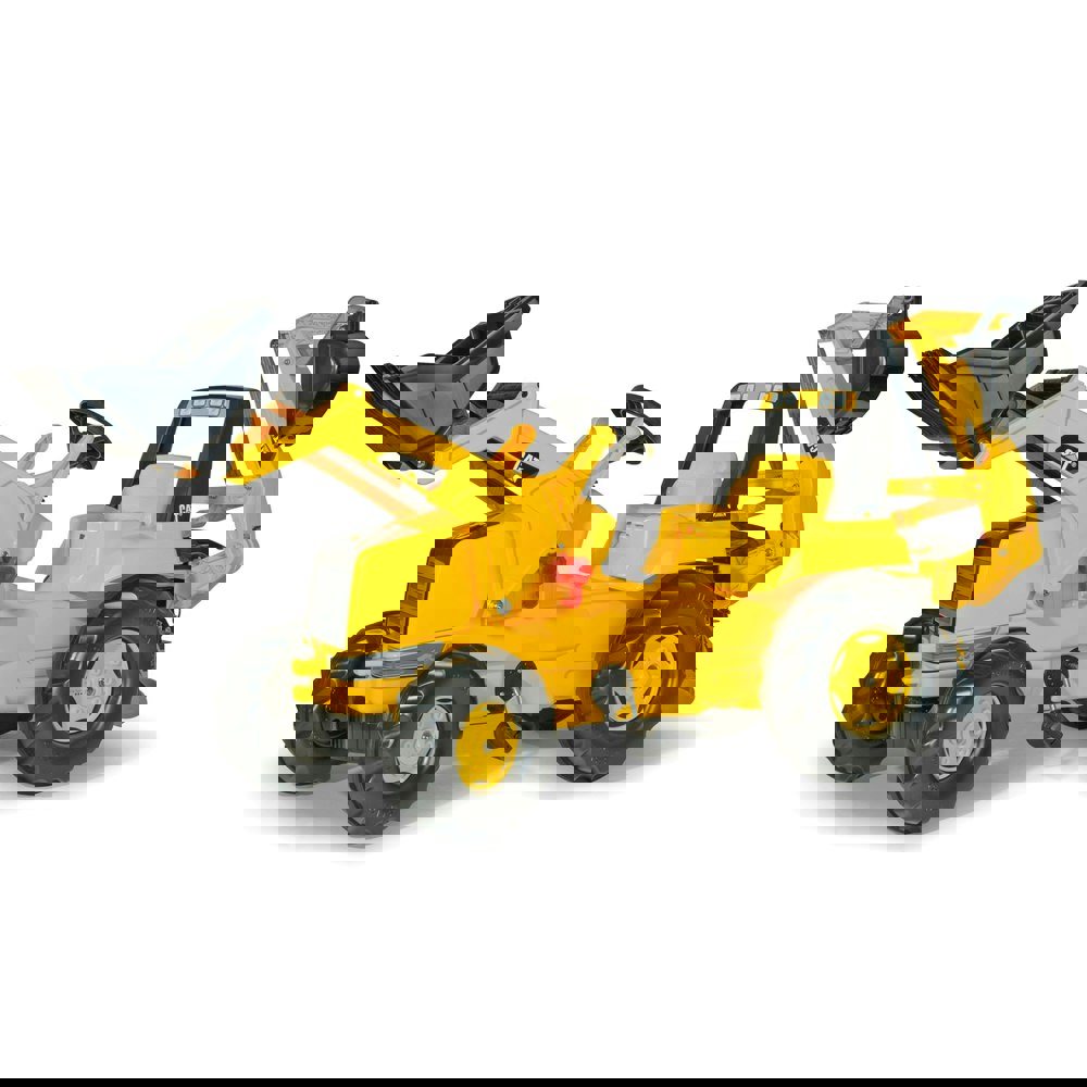 This large Caterpillar tractor has an adjustable seat, anti-slip pedals, all terrain wheels, front hitch pin, opening bonnet and a large frontloader that can be released, scooped and tipped. The rear excavator has its own seat, imitation hydraulic foot and two levers that operate the excavating bucket, which imitates exactly the action of a real CAT excavator. The tractor can be ridden with the rear excavator tucked back in its inoperative position.