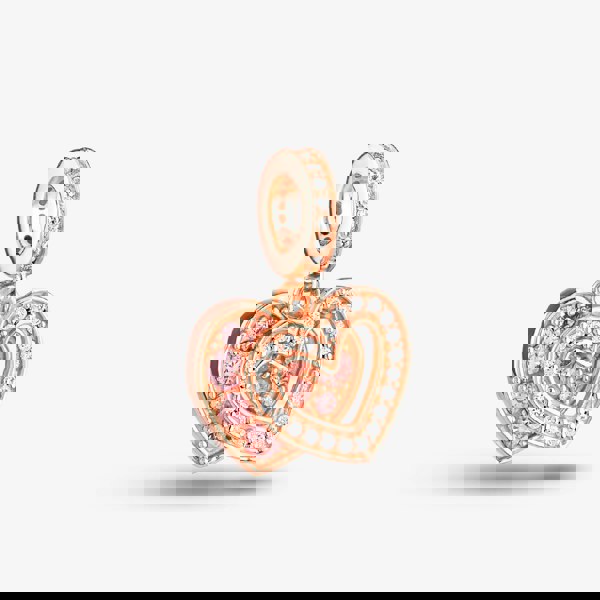 Rosa Lea Rose Gold-Plated 2 Heart Dangle Charm AM-THB032006 is crafted from sterling silver with rose gold plating. This double dangle charm includes a heart decorated with pink cubic zirconia stones in various sizes, set in four claws. Another heart is featured on top of the back heart, including multiple clear cubic zirconia stones for added contrast.