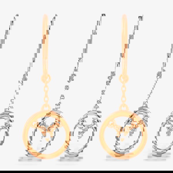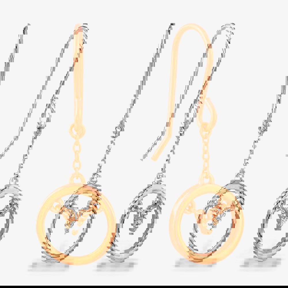 The Centrepiece design showcases a suspended diamond within a thick round bezel, held in place with a delicate trace chain. These pretty earrings fasten to your ear via the sturdy hook stem, from which the Centrepoint emblem is suspended via more trace chain to provide movement.