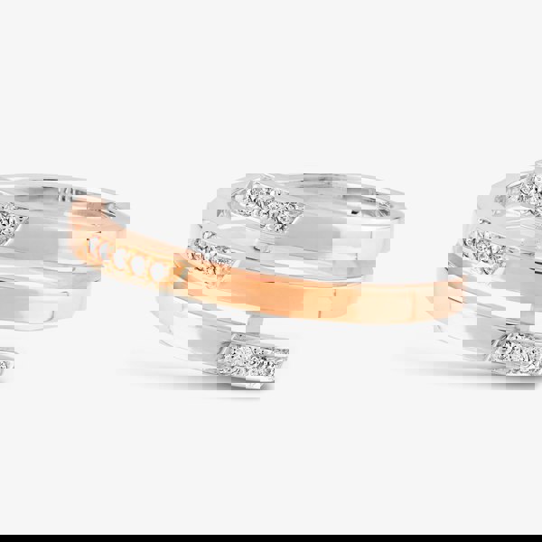 Coiled tightly like a spring, this pretty ring promises energy and excitement. Fifteen cubic zirconia are geometrically arranged on the front of this piece, utilising rose gold-plating to provide a pleasing juxtaposition of warm and cool tones.