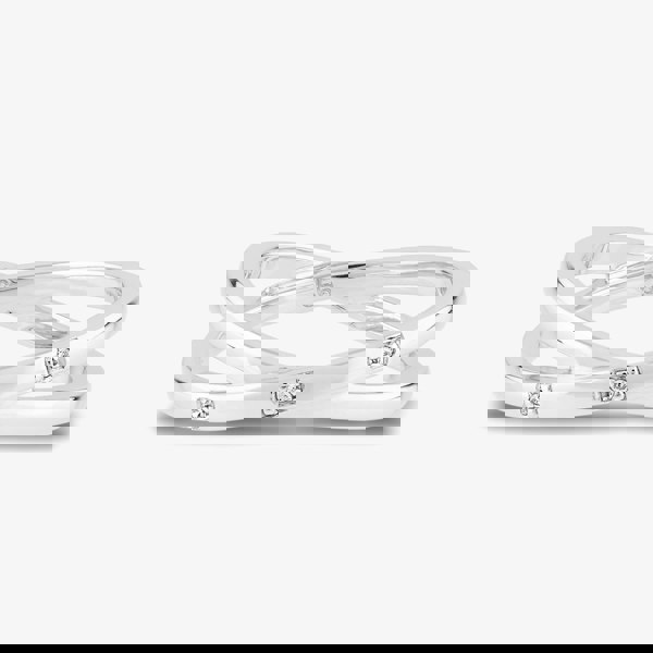 Reminiscent of a bridal set, these interlinked rings capture the hope and happiness a bride feels on her wedding day. The 'wedding band' serves as the base of the piece, whilst the larger three stone 'engagement ring' crosses over the top of the band.
