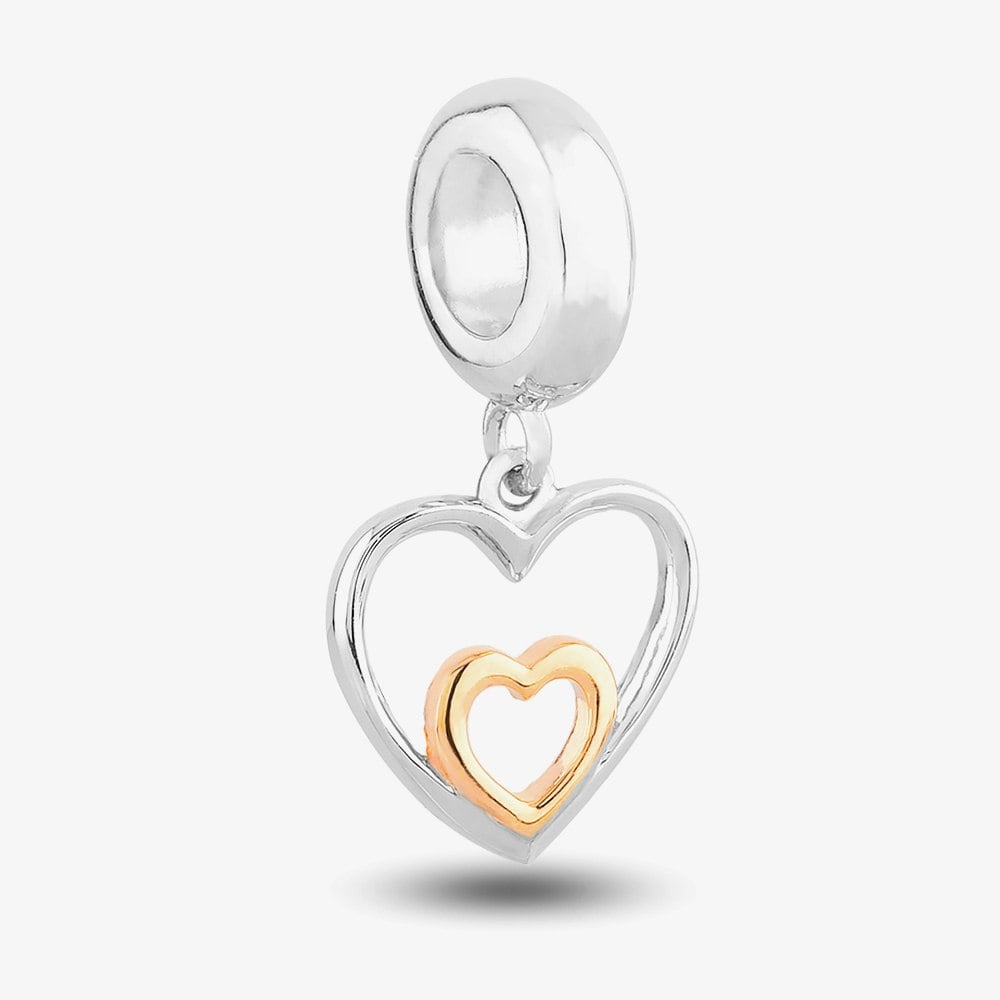 Rosa Lea Silver and Rose Gold Heart Shaped Charm AM-2THB029807 is made from sterling silver in the Shape of two hearts. Outer heart is silver with a smaller Rose gold heart on the inside.