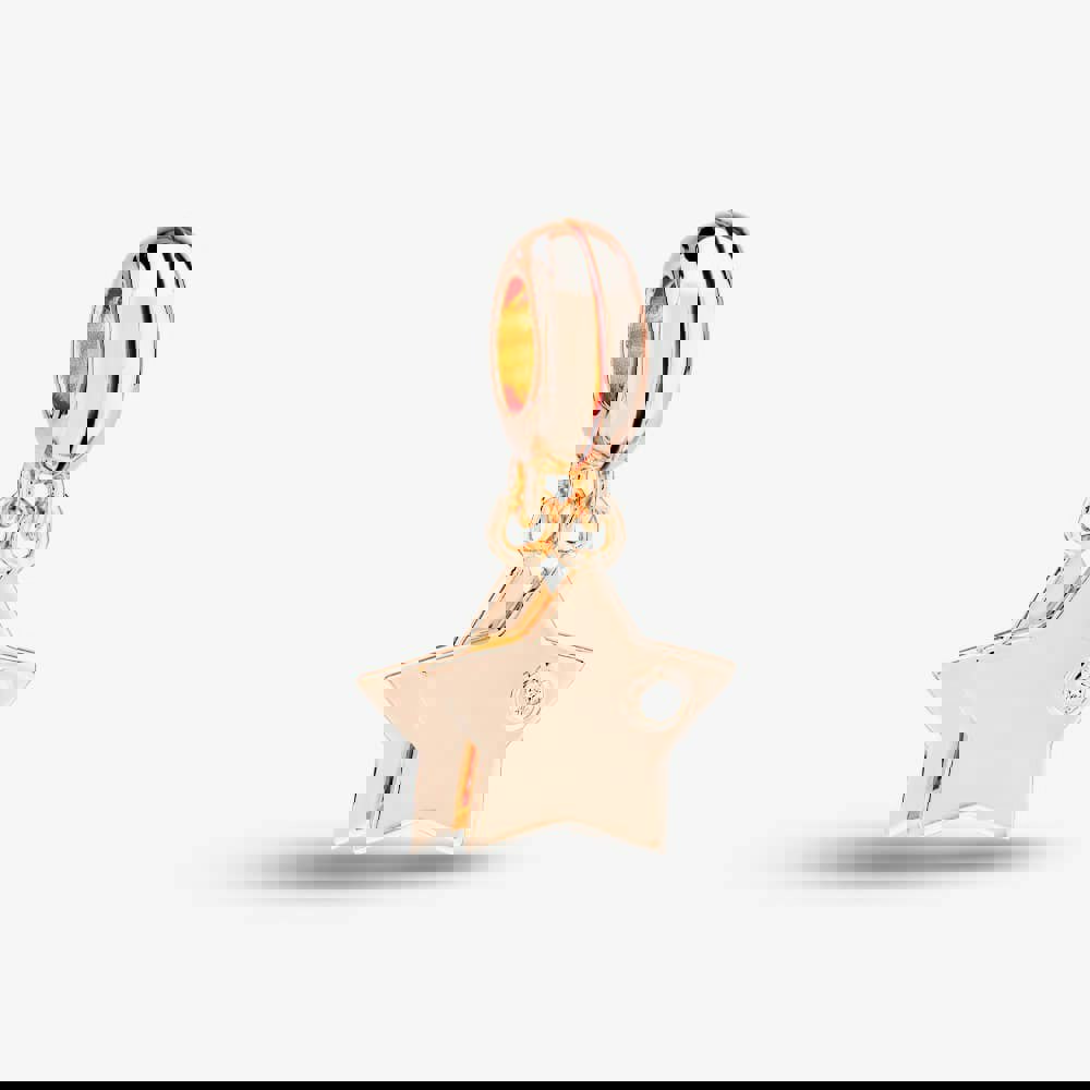 A playful finishing touch for a charm collection, the Rosa Lea Double Stars Dangle Charm is crafted in rose gold plated sterling silver and set with a white cubic zirconia stone. Formed from two separate star pieces, it offers styling flexibility, worn together for added movement or separately for a simpler look.