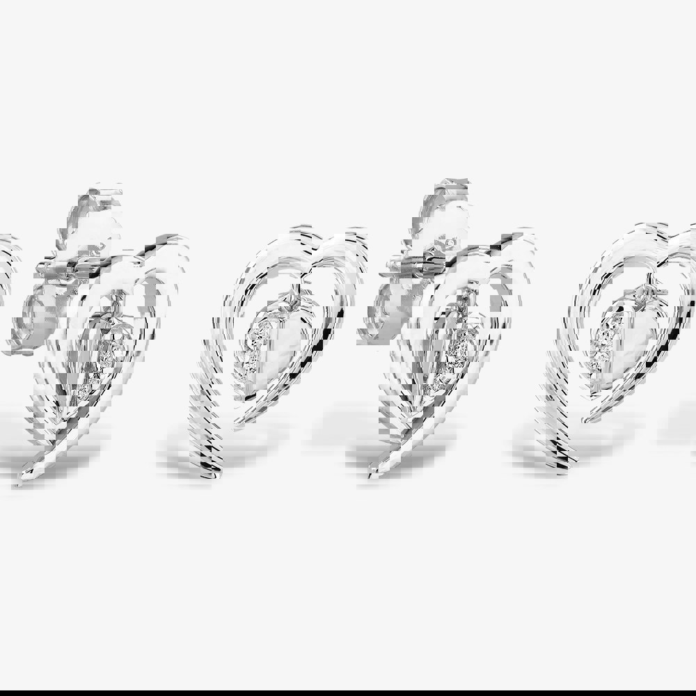 A textured folded heart, one half pavé and one half polished precious metal, hangs from an open abstract frame for a contemporary twist.