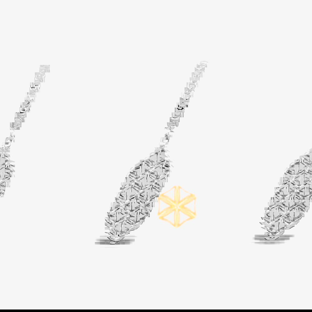A contemporary Rosa Lea dropper charm made from sterling silver composed of a bale with love hearts and two suspended discs. The first disc has an openwork geometric triangle pattern and the second is a plain disc ideal for adding an engraving.