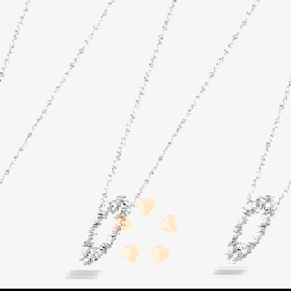The Rosa Lea Two Tone Heart Necklace AM-2THB031606 is created from sterling silver. This beautiful necklace features an alternating sterling silver tone and Rose Gold Plated heart open circle motif.