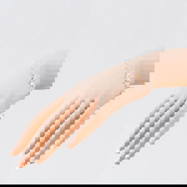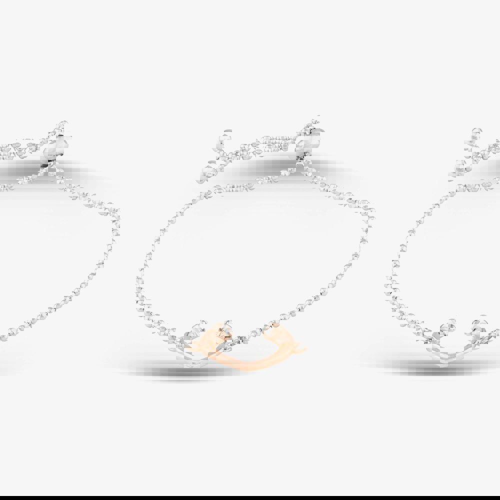 A pretty Rosa Lea bracelet with an adjustable sliding clasp. The belcher chain bracelet is made from sterling silver and measures 24cm long with an incomplete rose gold plated heart set with cubic zirconia stones at each end.