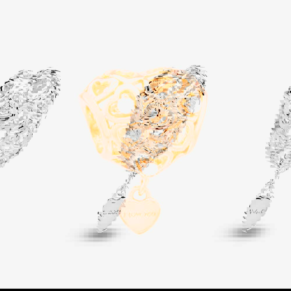 Rosa Lea openwork love heart shaped bead charm made from sterling silver and plated in rose gold with love heart detailing. This charm also has a white cubic zirconia stones and a heart shaped disc pendant engraved with I L♥VE YOU.