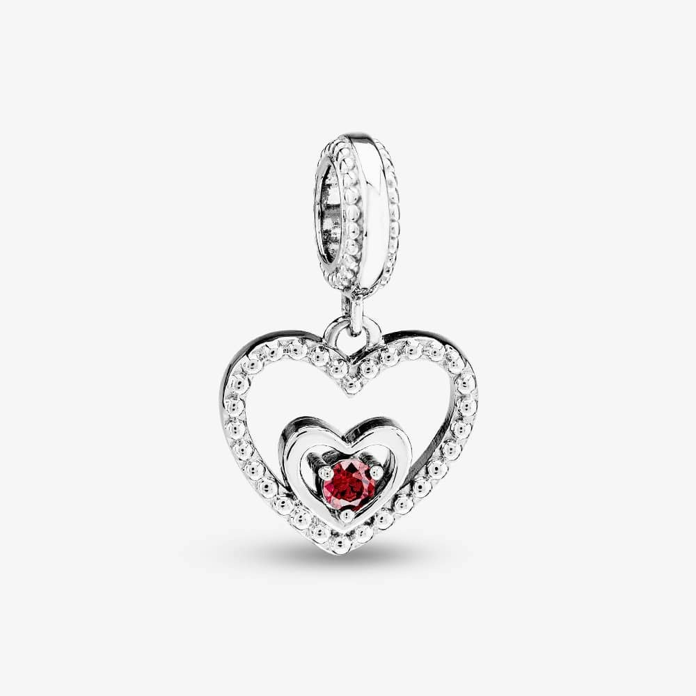 Bring a vivid accent to your collection with the Rosa Lea July Birthstone Heart Dangle Charm, a sterling silver dangle charm shaped as an openwork love heart. A smaller heart sits within the outline, while a red cubic zirconia adds a bright focal point, secured in a three-claw setting for a clean, defined finish.
