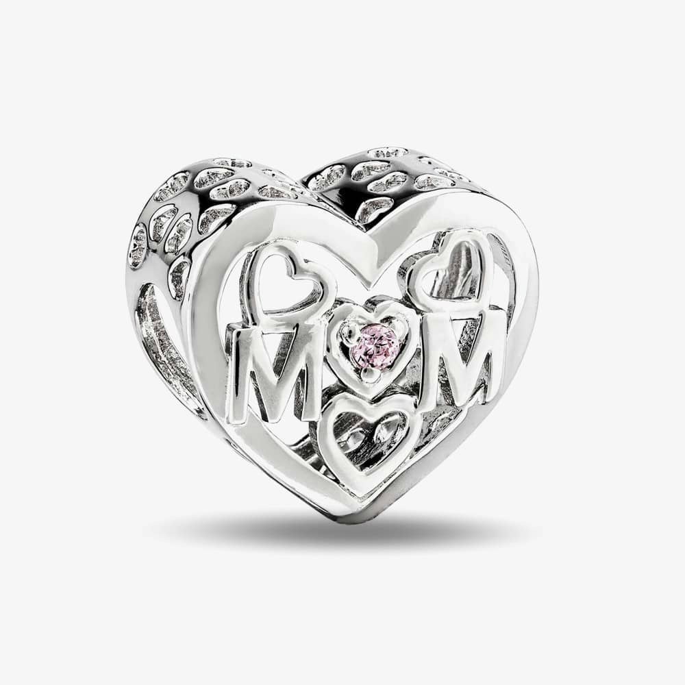 Celebrate a meaningful sentiment with the Rosa Lea Mom Heart Charm, a sterling silver bead charm shaped as a heart. Openwork detailing runs along the sides with love heart cut-outs, while the centre is finished with M♥M and a pink cubic zirconia set in the middle for a soft touch of colour.