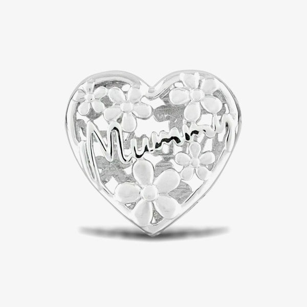 Delicate and meaningful, the Rosa Lea Mummy Heart Charm is a sterling silver bead charm with a heart-shaped silhouette and openwork detailing. Floral cut-outs frame the centre, where the word Mummy sits as the focal point, creating a thoughtful finish that stands out on a bracelet or bangle.