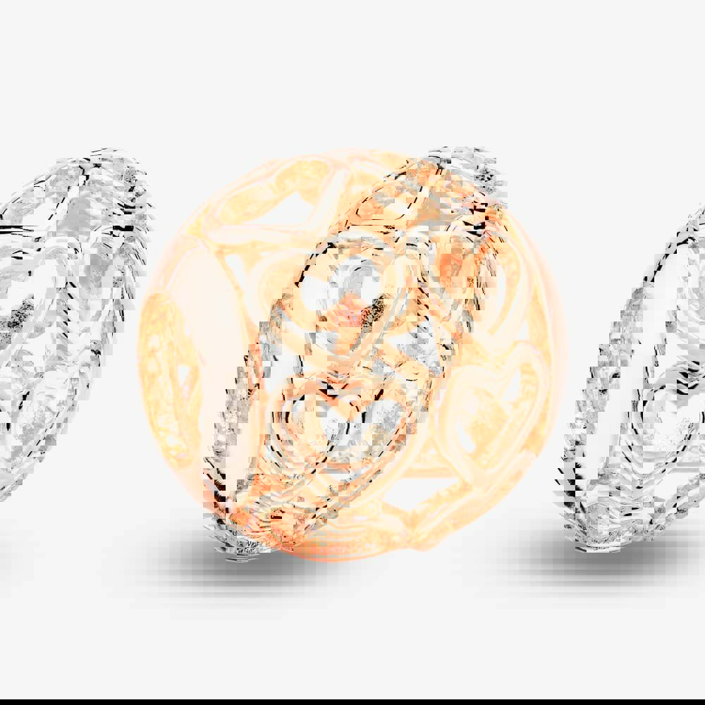 Intricate openwork detailing gives the Rosa Lea Openwork Heart Rows Charm a light, decorative finish. Made as a bead charm, it is crafted from sterling silver and finished in a rose gold colour, with two neat rows of love heart detailing around the round profile.