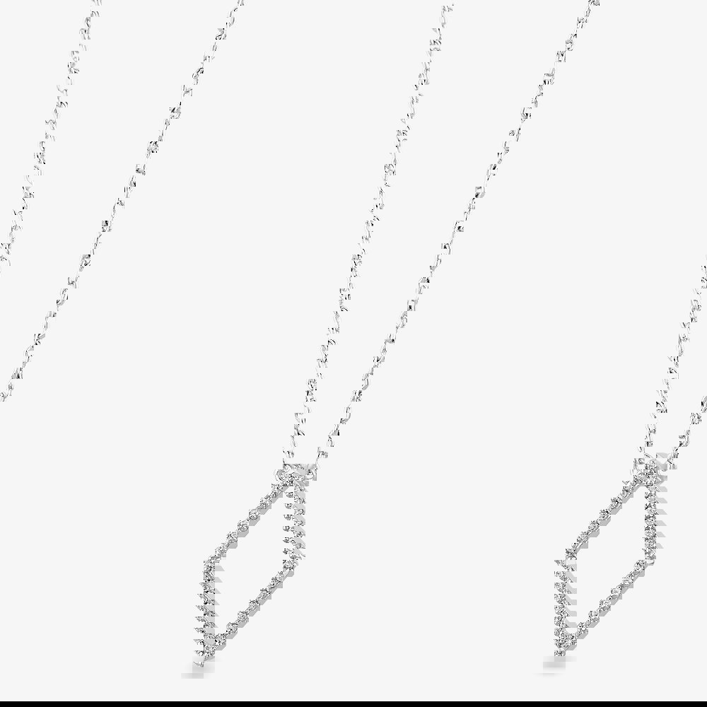 A simple & elegant sterling silver necklace crafted with an off centre square design with set with 1mm cubic zirconia stones completed with an 18 inch trace chain with lobster clasp fastening. Pair with the matching sterling silver & cubic zirconia pavé square stud earrings to complete the look.