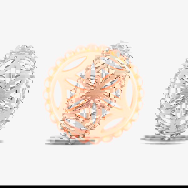 A pretty Rosa Lea charm made from sterling silver and plated in rose gold composed of a rounded shape with an openwork symmetrical flower in the centre and a beaded pattern along the sides.