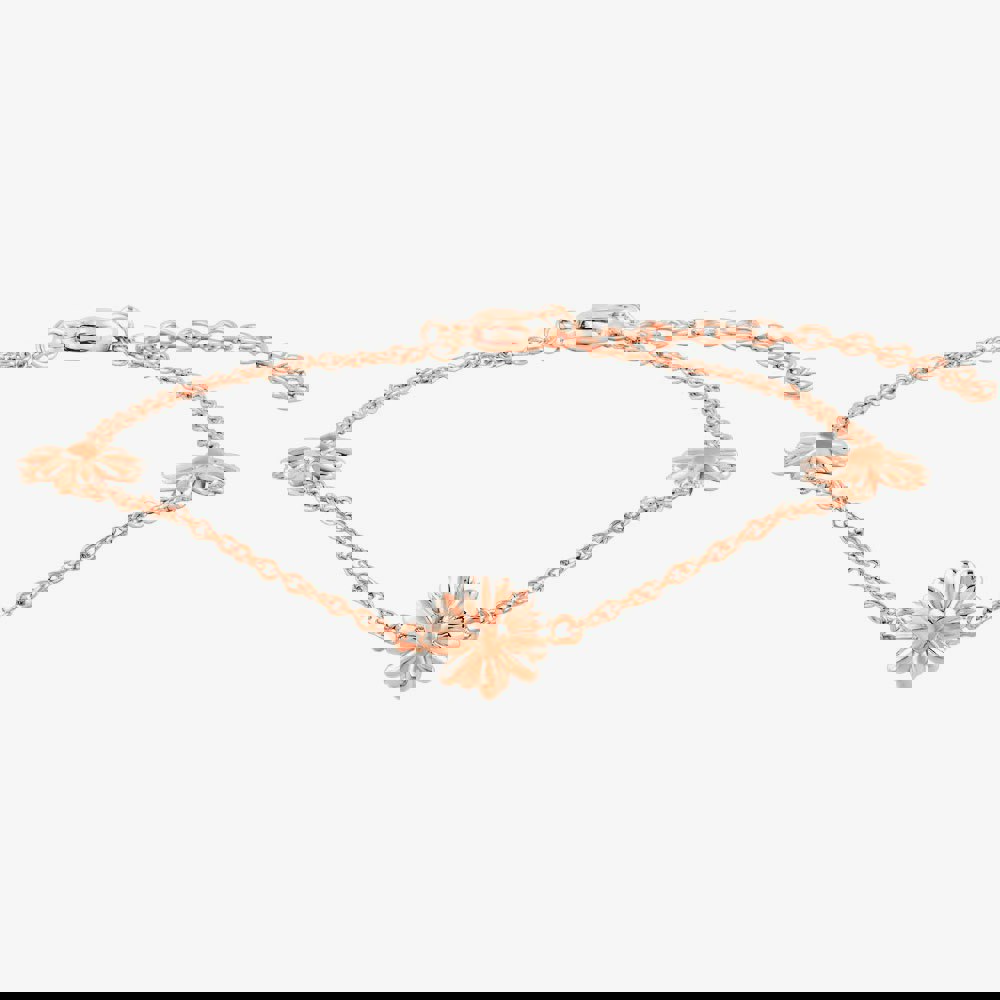 Rosa Lea Ladies Triple Rose Gold Plated Daisy Bracelet. This elegant bracelet is crafted from sterling silver with an adjustable chain, measuring from 16cm - 20cm. The bracelet features 3 sterling silver daisies each with a rose gold-plated heart-shaped centre, creating this simple yet beautiful bracelet.