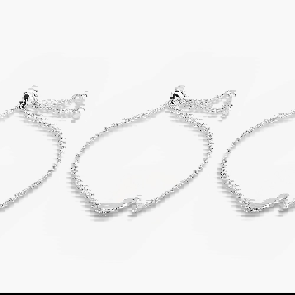 An elegant Rosa Lea bracelet with an adjustable sliding clasp. The belcher chain bracelet is made from sterling silver and measures 23cm long with a wave centrepiece set with clear cubic zirconia stones.