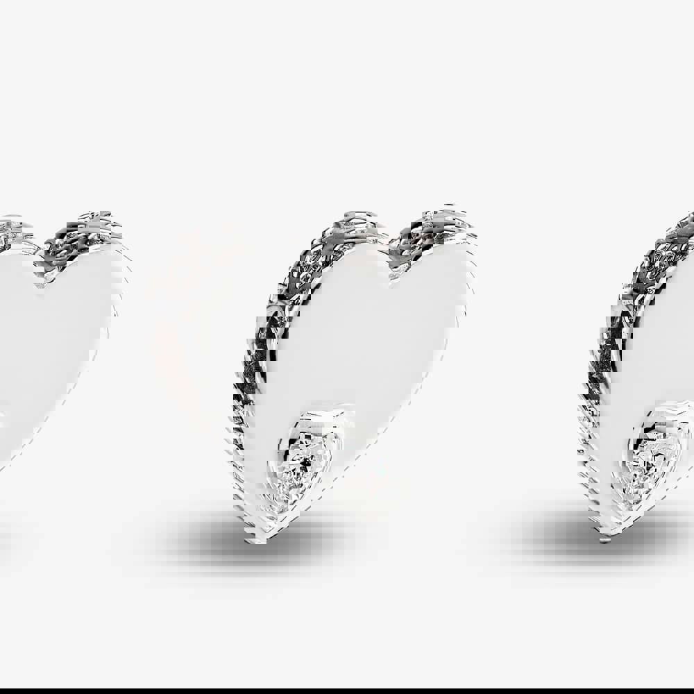 With its clean lines and romantic detailing, the Rosa Lea White Offset Heart Charm is a sterling silver bead charm with a love heart silhouette. Hearts are hollowed into the sides, while a heart-shaped white cubic zirconia sits at the bottom for a subtle point of sparkle. A plain central section keeps the design balanced and provides space for engraving, making it easy to add a personal touch.