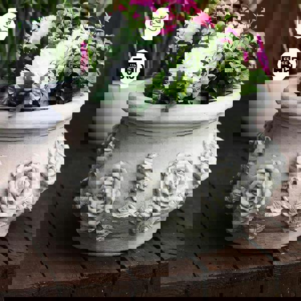 Solid stone cast planter with stunning 3-D rose design around the whole pot. A beautiful addition to any garden. The planter is brand new but designed and dyed to look perfectly aged, pot has drainage. A beautiful example of quality stoneware which cannot fail to impress. A beautifully decorated outdoor arrangement and genuine quality.
