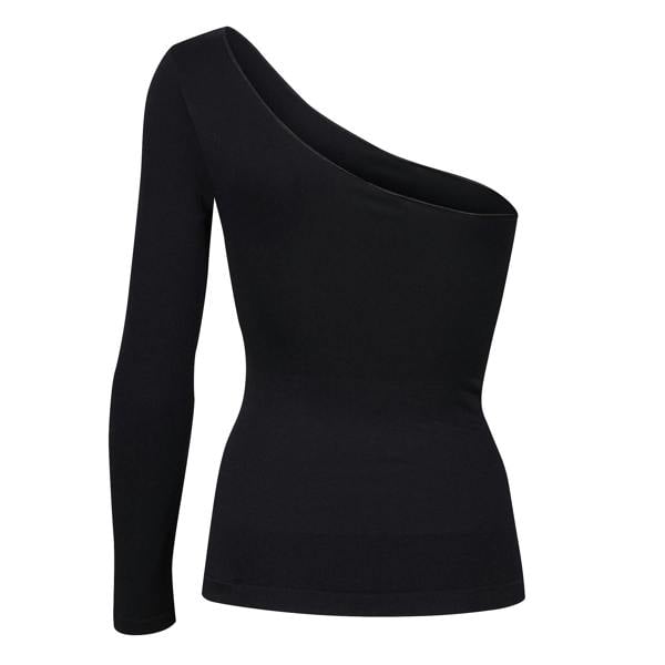 Clean lines and an asymmetric neckline define the Ruey Essentials One Shoulder Top. This ladies’ top sits close to the body for a streamlined silhouette, keeping the look minimal and considered for everyday dressing. Finished in black, it works easily across casual and more polished outfits, whether worn alone or layered under outerwear.