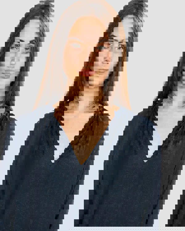 This long sleeve top is created from a fine jacquard fabric with a delicate swirling pattern. The open V-neckline has fine gathered detailing matching with the gathered back yoke seam of this floaty feminine top.