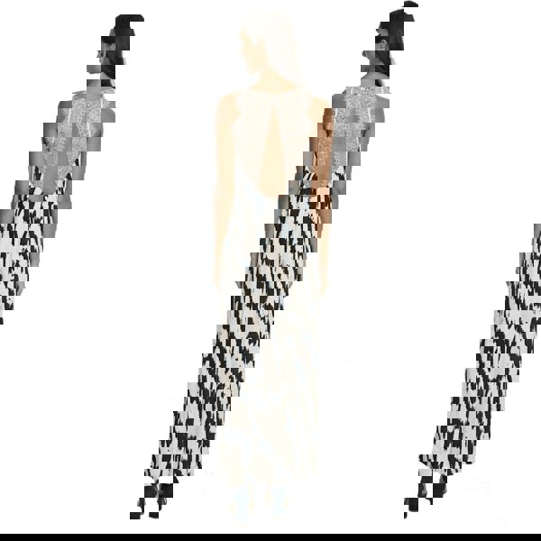 This floor length printed dress is cut from a draping viscose fabric. A dramatic open back is completed with a delicate lace, creating a seductive and elegant long cocktail dress.