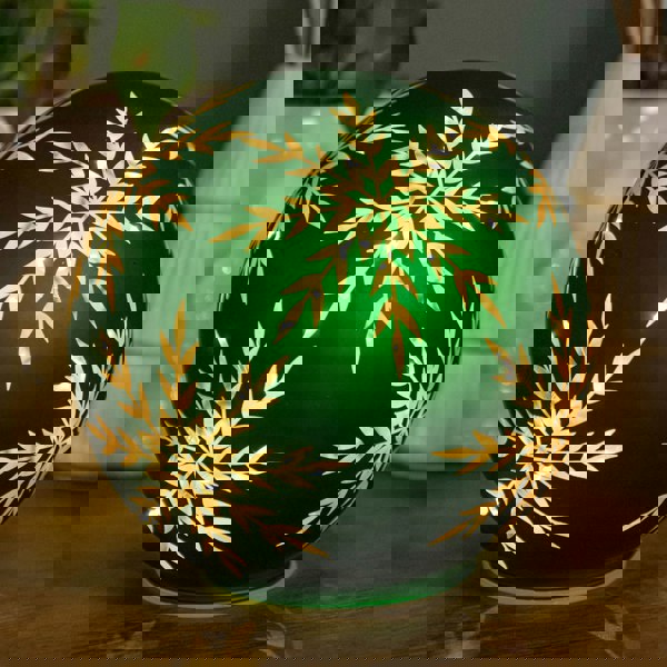The lit glass ball is illuminated with Gold silhouettes of snowflakes with a festive Green colour
