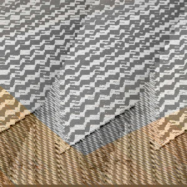Elevate your outdoor living space with this contemporary Atlantis Slate Outdoor Patio Rug Mat. Showcasing a stylish grey and white zig zag pattern, this modern outdoor patio rug blends neutral tones with eye catching design, making it a versatile addition to patios, terraces, balconies and interior spaces.