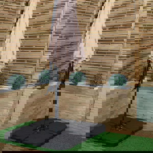 Stability is supported by the included base weights. The four-section base is crafted from strong plastic resin and is designed to be simple to assemble and fill, providing dependable support for the parasol in outdoor conditions.