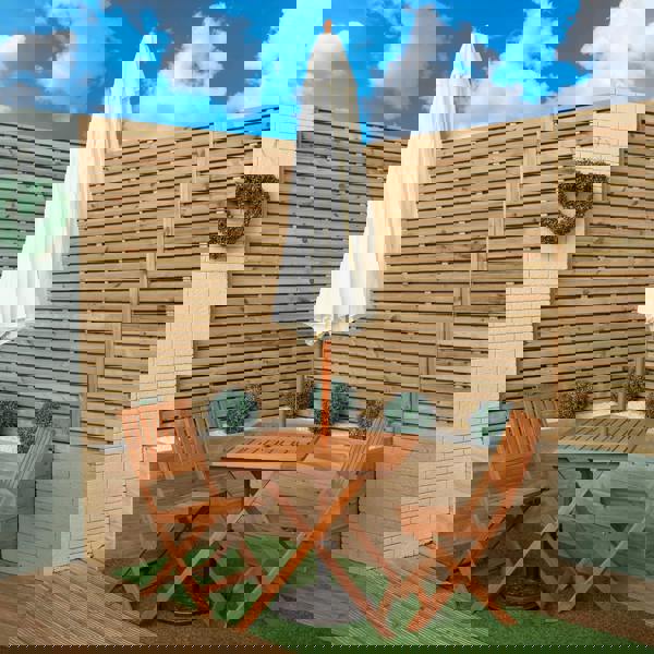 The set includes a wooden, square folding table with 2 wooden, folding chairs, a cream parasol and parasol base. An outdoor wooden patio table and chairs set brings a unique blend of elegance, comfort and practicality to your outdoor space. The texture and colour of the wood can blend seamlessly with natural surroundings that enhances your outdoor experience. Finished with teak oil, the design of the table features a cross leg frame and a slatted table top with a parasol hole and the chairs are a simplistic yet contemporary style with a modern slatted wood. When not in use the set can be easily folded down and stored away.