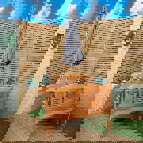 The set includes a wooden, rectangular folding table with 2 wooden benches, a grey parasol and parasol base. An outdoor wooden patio table with benches brings a unique blend of elegance, comfort and practicality to your outdoor space. The texture and colour of the wood can blend seamlessly with natural surroundings that enhances your outdoor experience. Finished with teak oil, the design of the table features a cross leg frame and a slatted table top with a parasol hole and the benches are a simplistic yet contemporary style with a modern slatted wood. When not in use the table can be easily folded down and stored away.