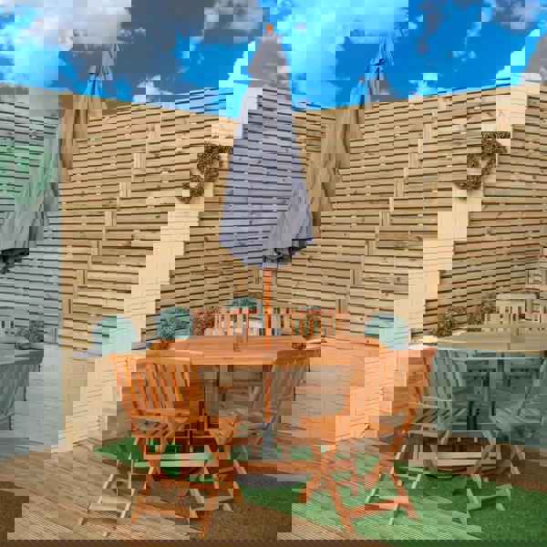 The set includes a wooden, rectangular folding table with 4 wooden, folding chairs, a grey parasol and parasol base. An outdoor wooden patio table and chairs set brings a unique blend of elegance, comfort and practicality to your outdoor space. The texture and colour of the wood can blend seamlessly with natural surroundings that enhances your outdoor experience. Finished with teak oil, the design of the table features a cross leg frame and a slatted table top with a parasol hole and the chairs are a simplistic yet contemporary style with a modern slatted wood. When not in use the set can be easily folded down and stored away.