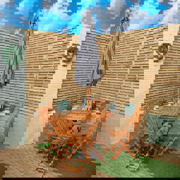 The set includes a wooden, square folding table with 4 wooden, folding chairs, a grey parasol and parasol base. An outdoor wooden patio table and chairs set brings a unique blend of elegance, comfort and practicality to your outdoor space. The texture and colour of the wood can blend seamlessly with natural surroundings that enhances your outdoor experience. Finished with teak oil, the design of the table features a cross leg frame and a slatted table top with a parasol hole and the chairs are a simplistic yet contemporary style with a modern slatted wood. When not in use the set can be easily folded down and stored away.