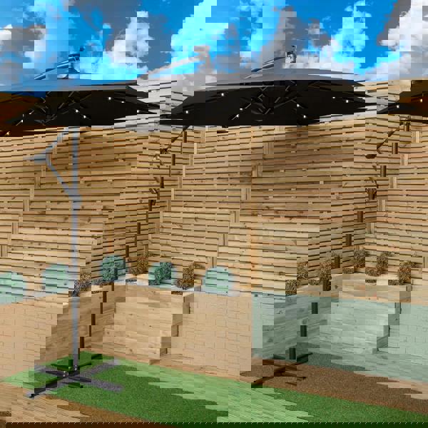 The table and chair frames are made from steel with a powder-coated finish, while the chairs feature a textilene back and fold away neatly for convenient storage. Each chair offers multiple reclining positions, adjusted via the seat handles, so everyone can settle in comfortably. For shade, the black banana parasol features a 3m canopy and a crank handle for smooth opening and closing. As evening arrives, 24 white LED lights integrated into the canopy ribs help create a welcoming ambience. Base weights are included and can be filled with sand or water for secure positioning. The set is supplied flat packed and requires self-assembly.