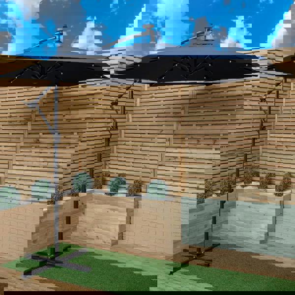 The set includes a black, round tempered glass top table and 4 multi-position chairs. Steel frames with a powder-coated finish add strength and durability, while the chairs feature a textilene backing and fold away neatly for convenient storage. Recline to your preferred angle by adjusting the seat handles, then enjoy shade from the 3m canopy parasol. As evening arrives, 24 white LED lights integrated into the canopy ribs create a welcoming ambience, with a crank handle for smooth opening and closing. For stability, each base weight can be filled with sand or water. Supplied flat packed; self-assembly is required.
