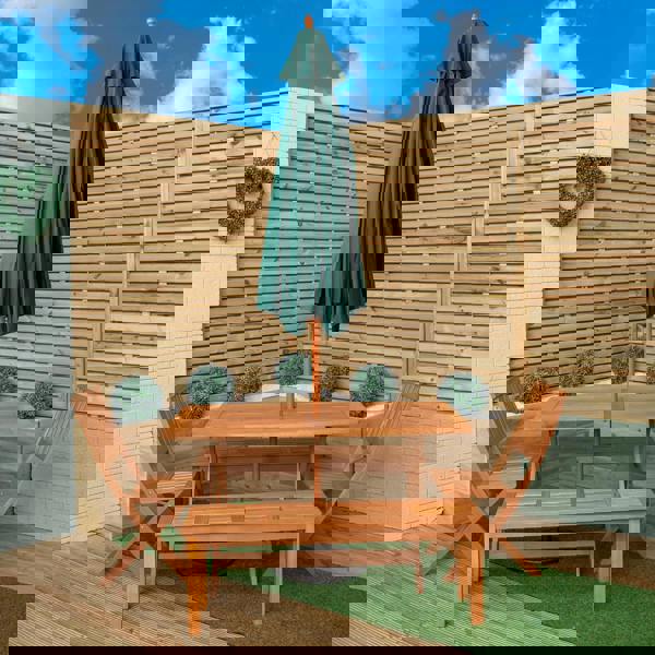 The set includes a wooden, rectangular table with 2 wooden, benches, a green parasol and parasol base. An outdoor wooden patio table set brings a unique blend of elegance, comfort and practicality to your outdoor space. The texture and colour of the wood can blend seamlessly with natural surroundings that enhances your outdoor experience. Finished with teak oil, the design of the table features a slatted table top with a parasol hole and the backless benches are a simplistic yet contemporary style with a modern slatted wood.